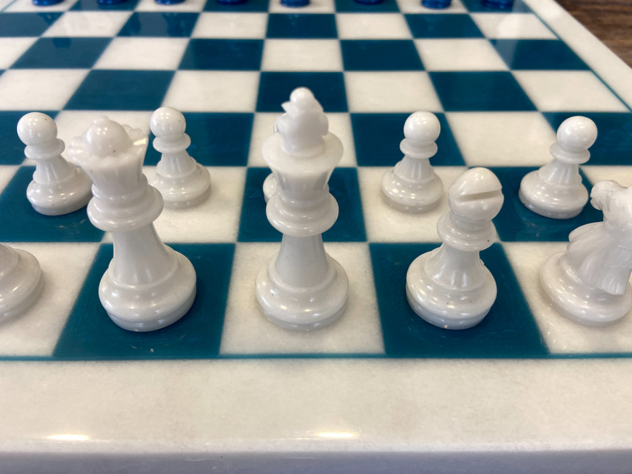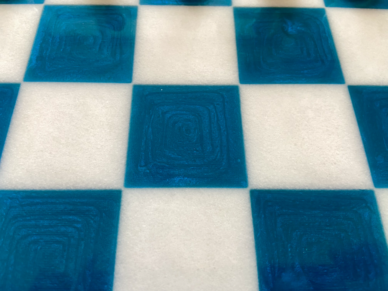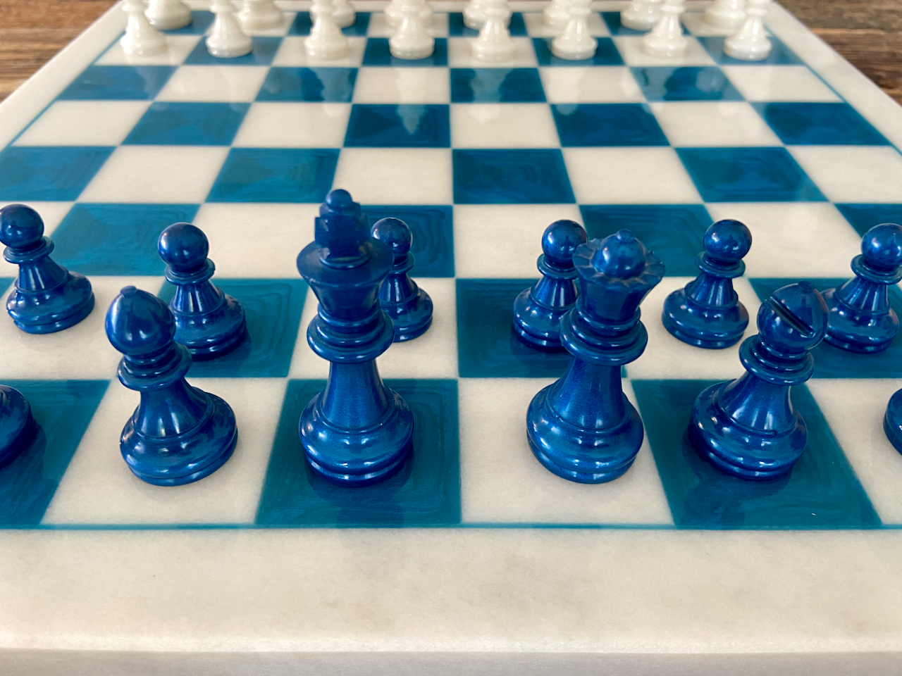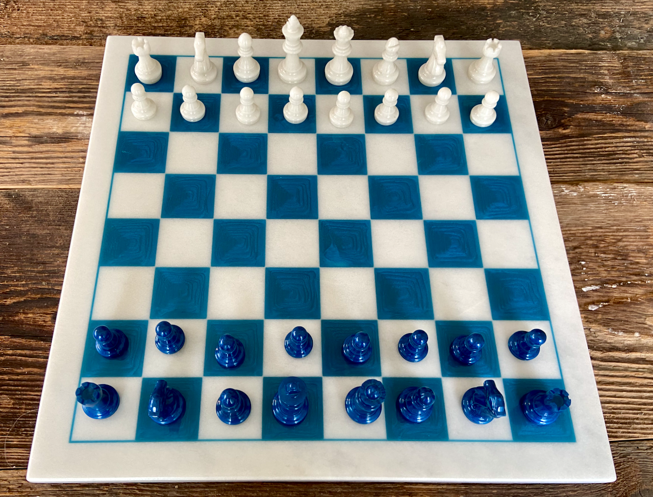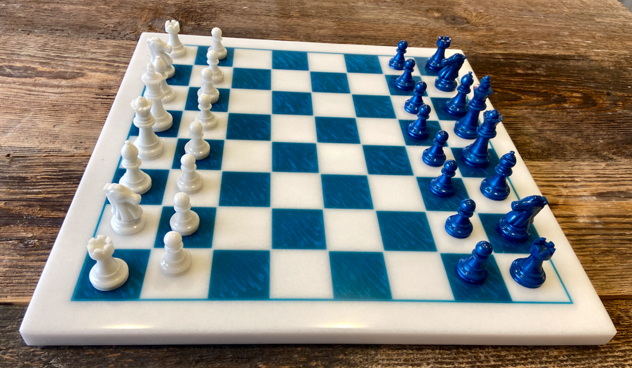 - Spielfiguren: Die weissen Schachfiguren sind aus Marmorsand und Epoxid gegossen, das verleiht ihnen Robustheit und Glanz, die blauen Figuren sind aus Epoxy mit Farbpigmenten hergestellt.
